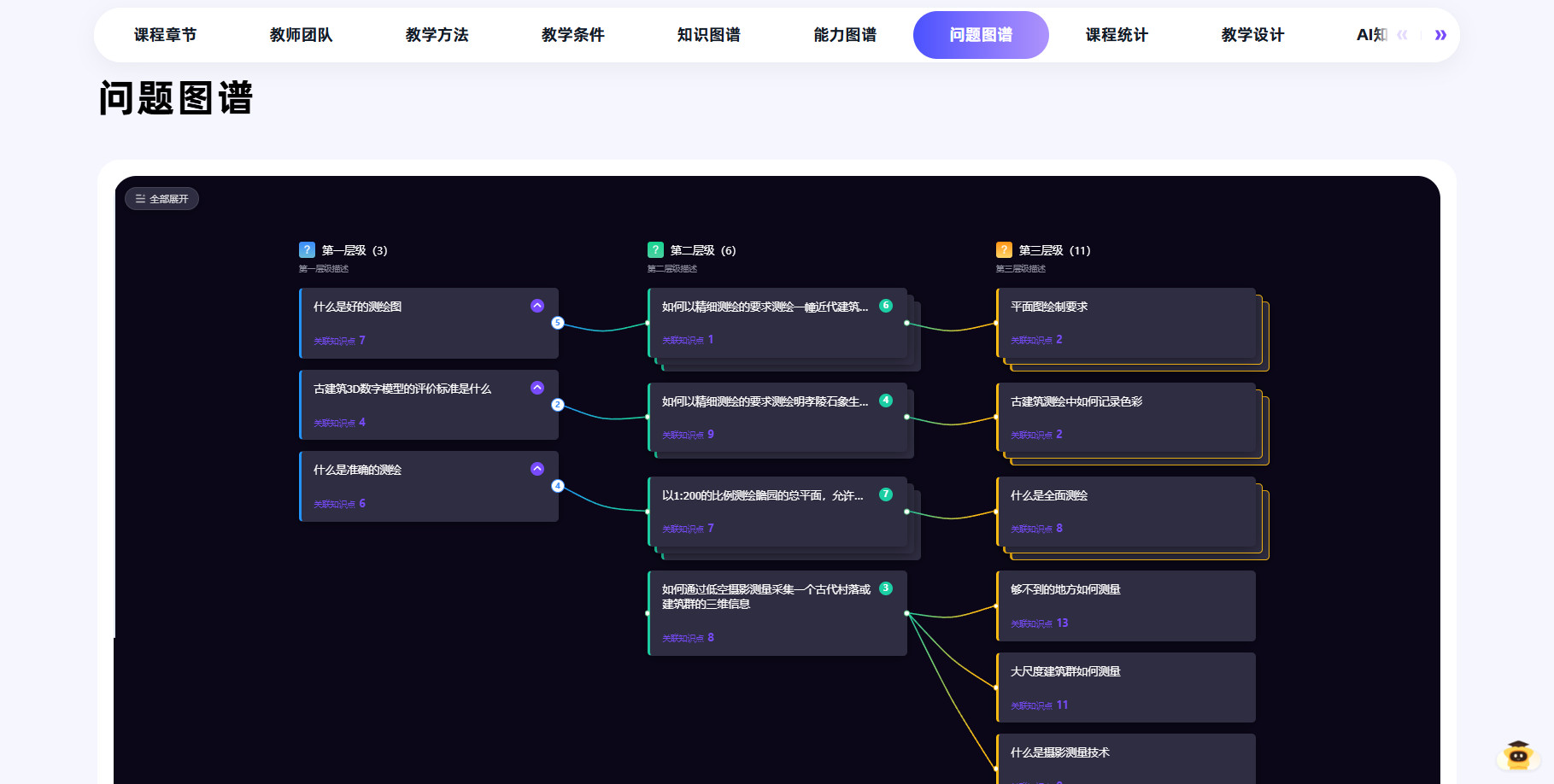 目前,该课程已完成知识图谱的初步建设,不仅提供了课件、视频等学习资料,学生还可以在问题图谱等工具的辅助下完成自学,从而提高课堂教学的针对性和学生学习效率。