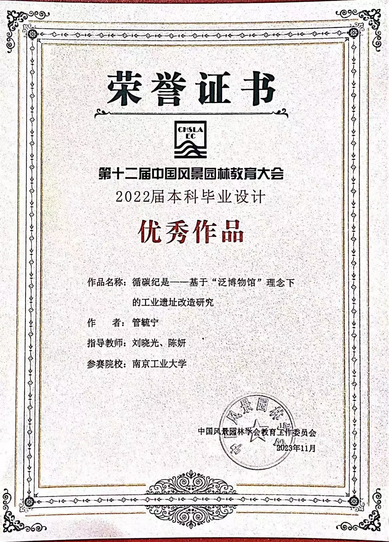 在同期举办的全国优秀本科毕业设计评选,共评选出30份优秀毕设作品。我校建筑学院风景园林专业2022届毕业生管毓宁、吴蕴涵、黄君祎的毕业设计《循碳纪是:基于“泛博物馆”理念下的工业遗址改造研究》,在刘晓光、陈妍老师两位老师的悉心指导下,经过激烈的角逐,顺利通过初评与专家终评,喜获此项荣誉,两位老师荣获“优秀指导教师”称号。