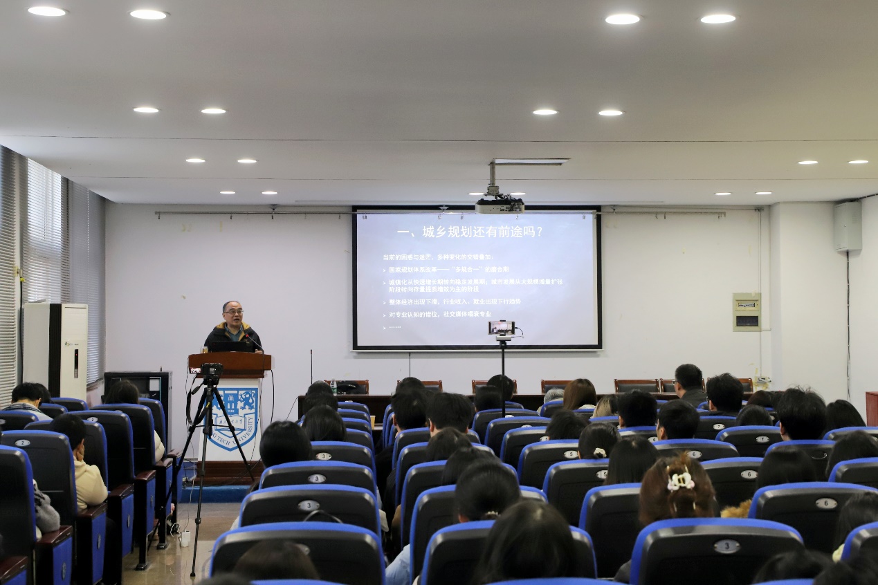 2025年12月5日,南京工业大学城乡规划专业专创融合系列讲座首讲在博学楼633报告厅举行,同济大学建筑与城市规划学院孙施文教授应建筑学院邀请作题为“城乡规划的未来”的专题报告。孙施文教授是中国城市规划学会常务理事和学术工作委员会主任委员,教育部高等学校城乡规划专业教学指导分委员会秘书长。建筑学院胡振宇、王江波、魏羽力、李哲睿等老师与近百名本科生和研究生参会,讲座由学院副院长方遥教授主持。