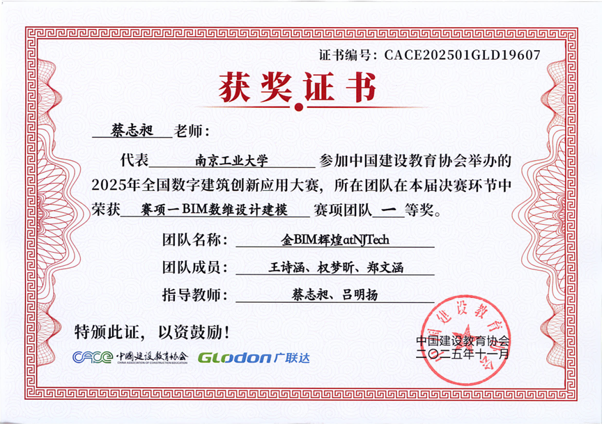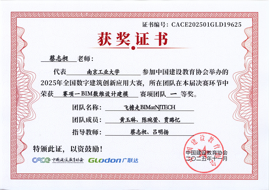 近日,2025年“第十七届全国数字建筑创新应用大赛”全国总决赛圆满落幕。建筑学院蔡志昶、吕明扬老师担任指导教师的三支参赛队伍在“BIM数维设计建模”赛项中表现优异,全部入围总决赛并最终获奖,共获全国一等奖2项、三等奖1项,展现出学院在数字化建筑教学与实践创新中的扎实成效。
